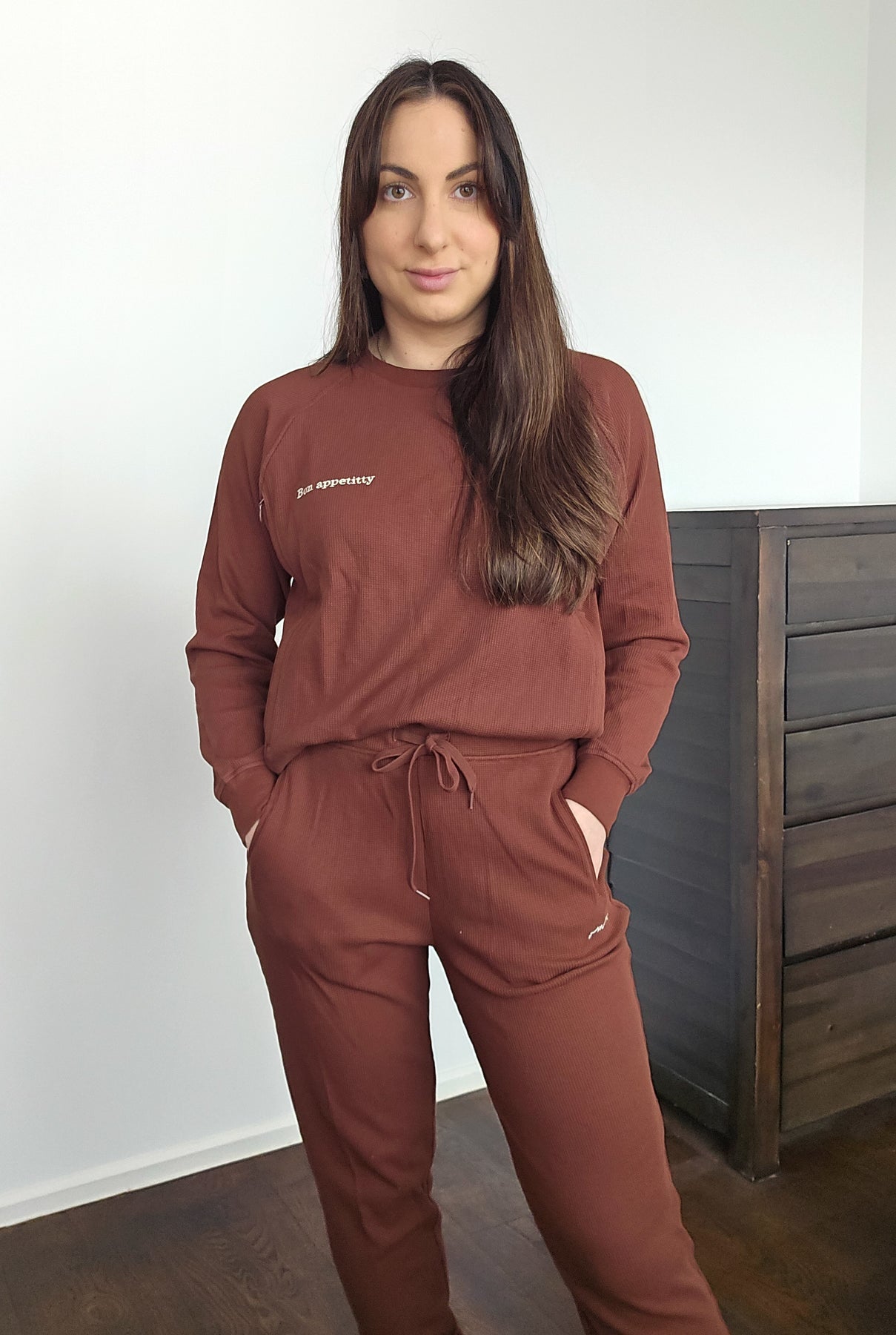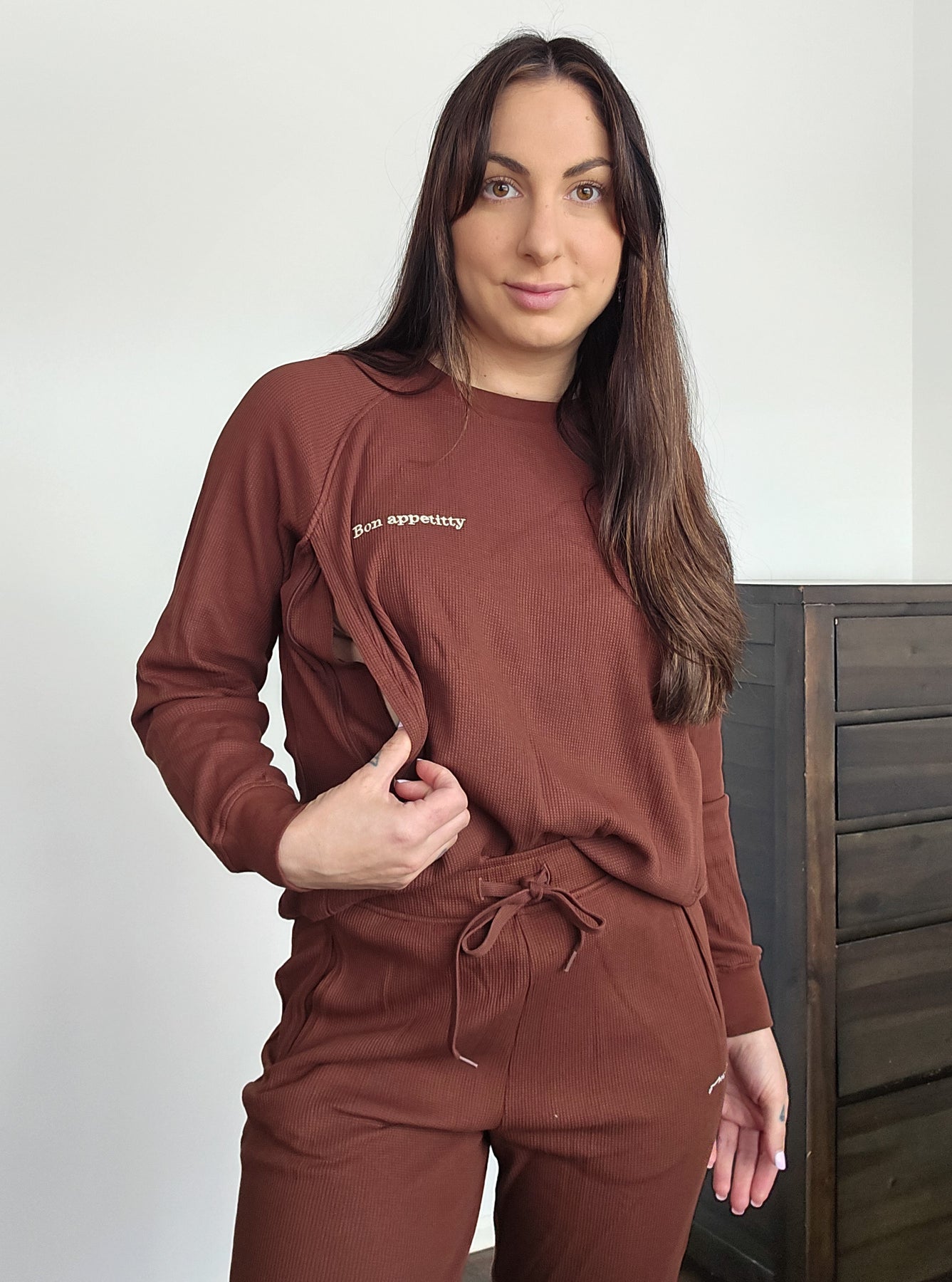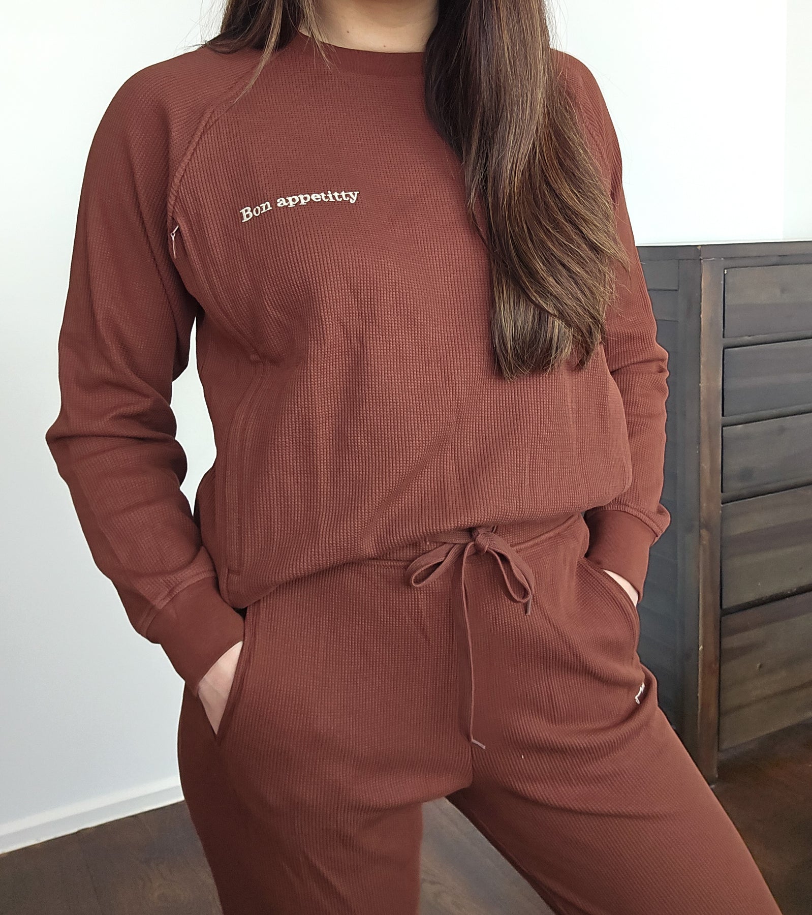 Relaxed-fit long sleeve crew (now in a raglan sleeve style) with side zips for discreet breastfeeding access, teamed with relaxed track pant. Featuring an elasticated waist with drawcord, ribbed trimmings and cuffs and side slit pockets to store your essentials, this loungewear set is the ultimate mum uniform.